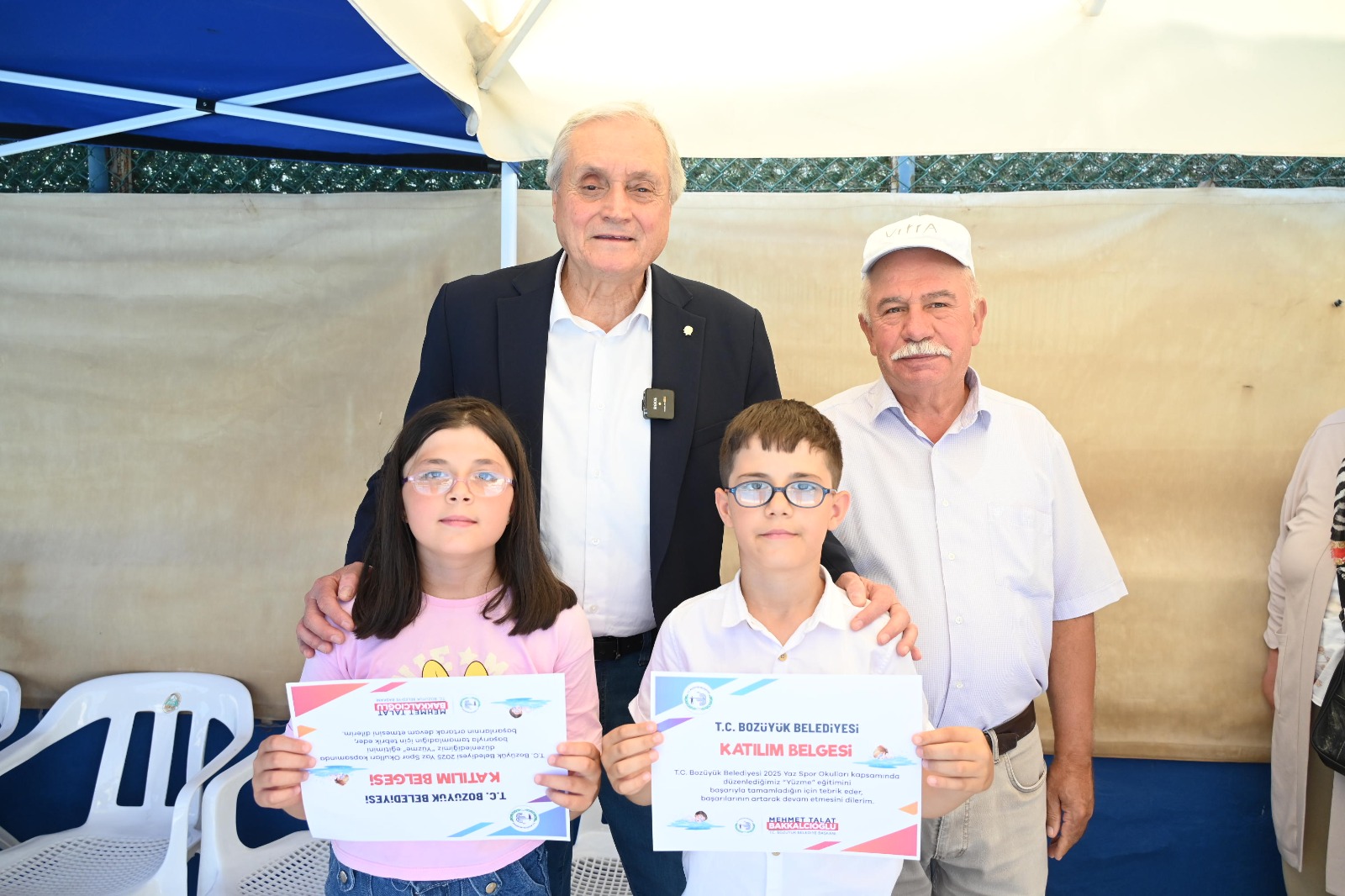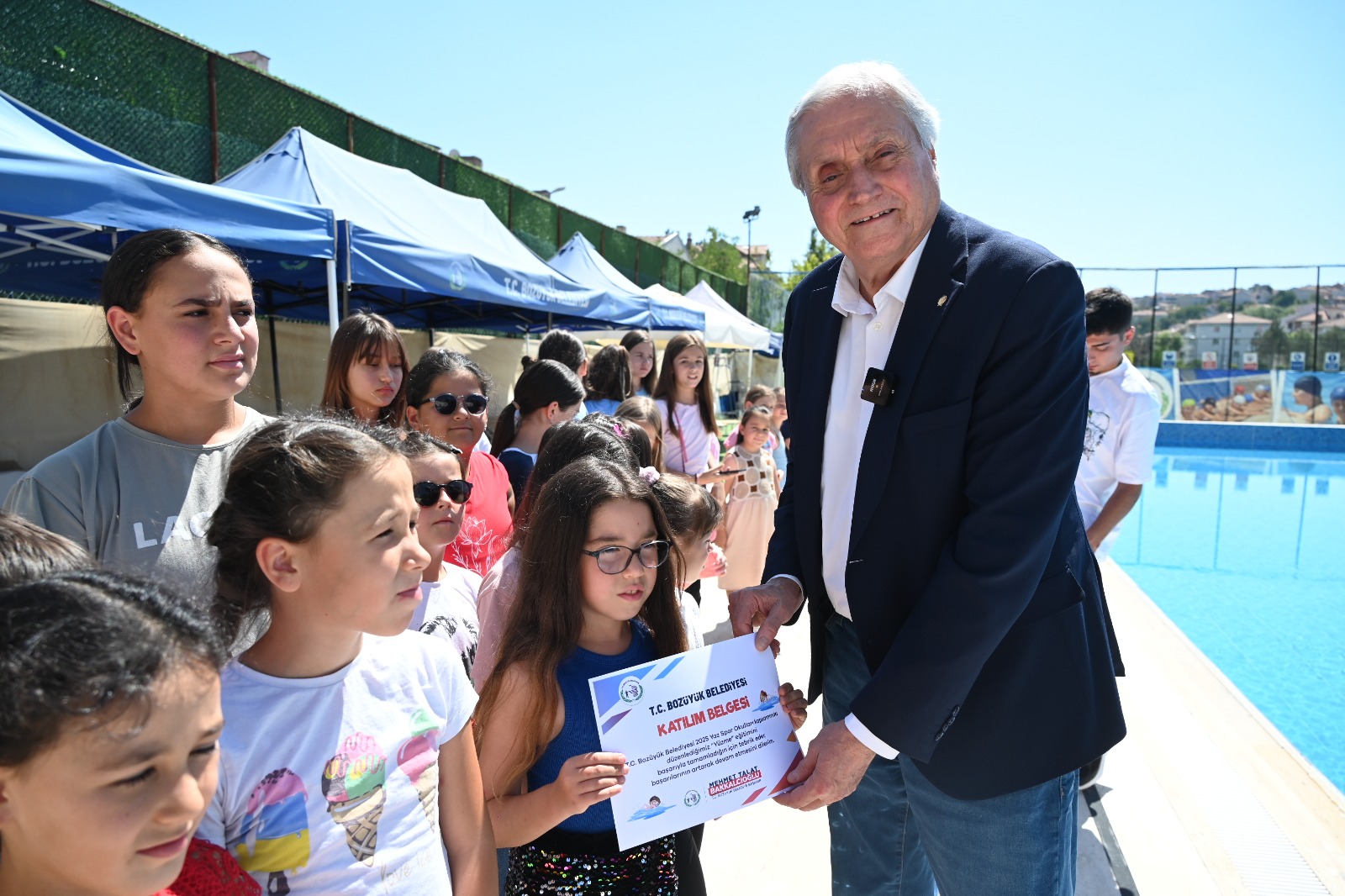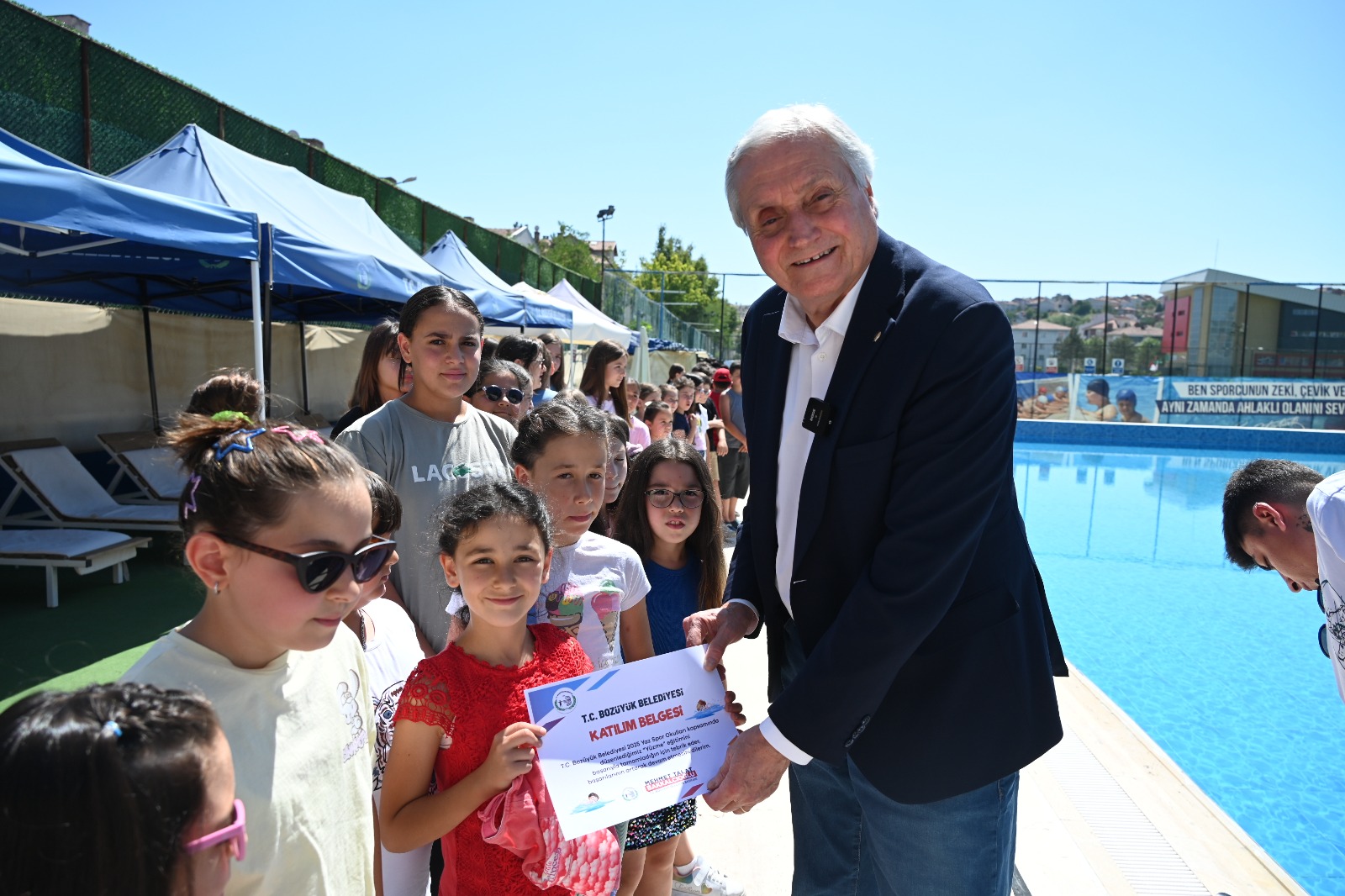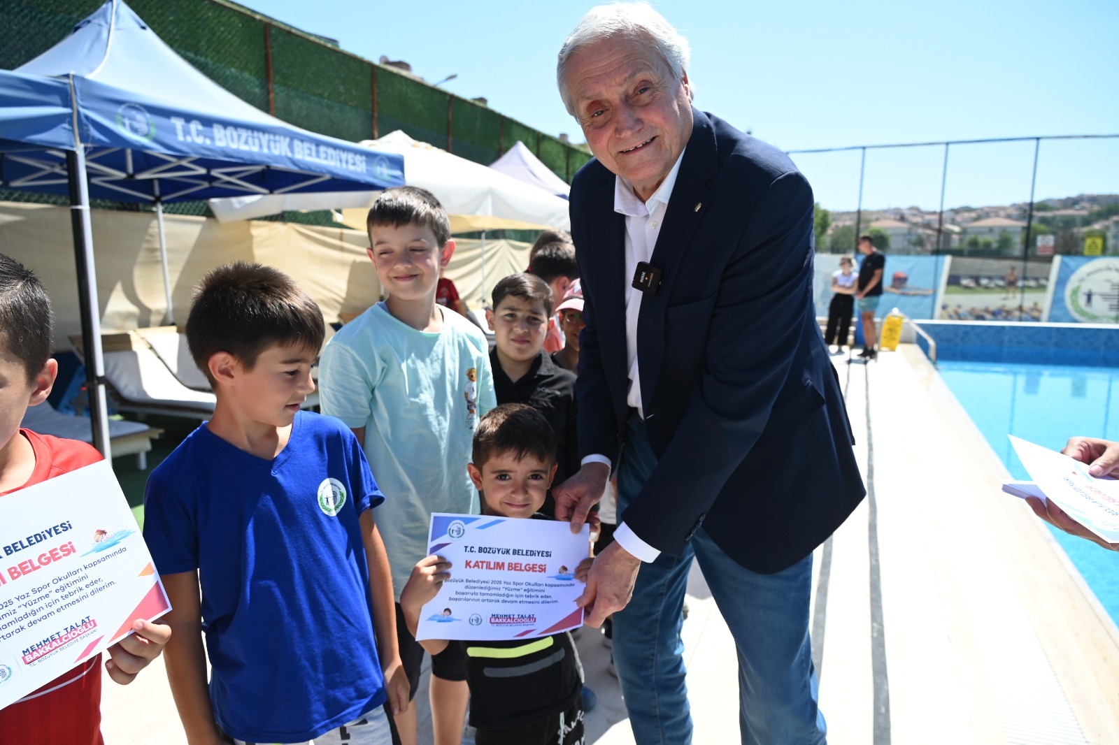 Bozüyük Belediyesi Yaz Spor Okulları yüzme kursunu başarı ile tamamlayan öğrenciler katılım belgelerini Bozüyük Belediye Başkanı Mehmet Talat Bakkalcıoğlu’nun elinden aldı.