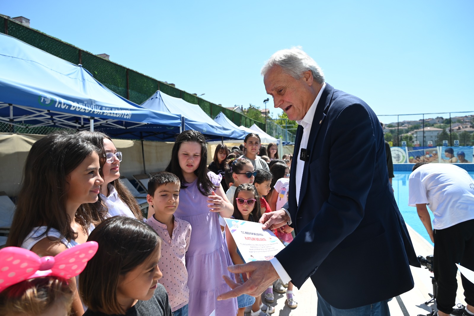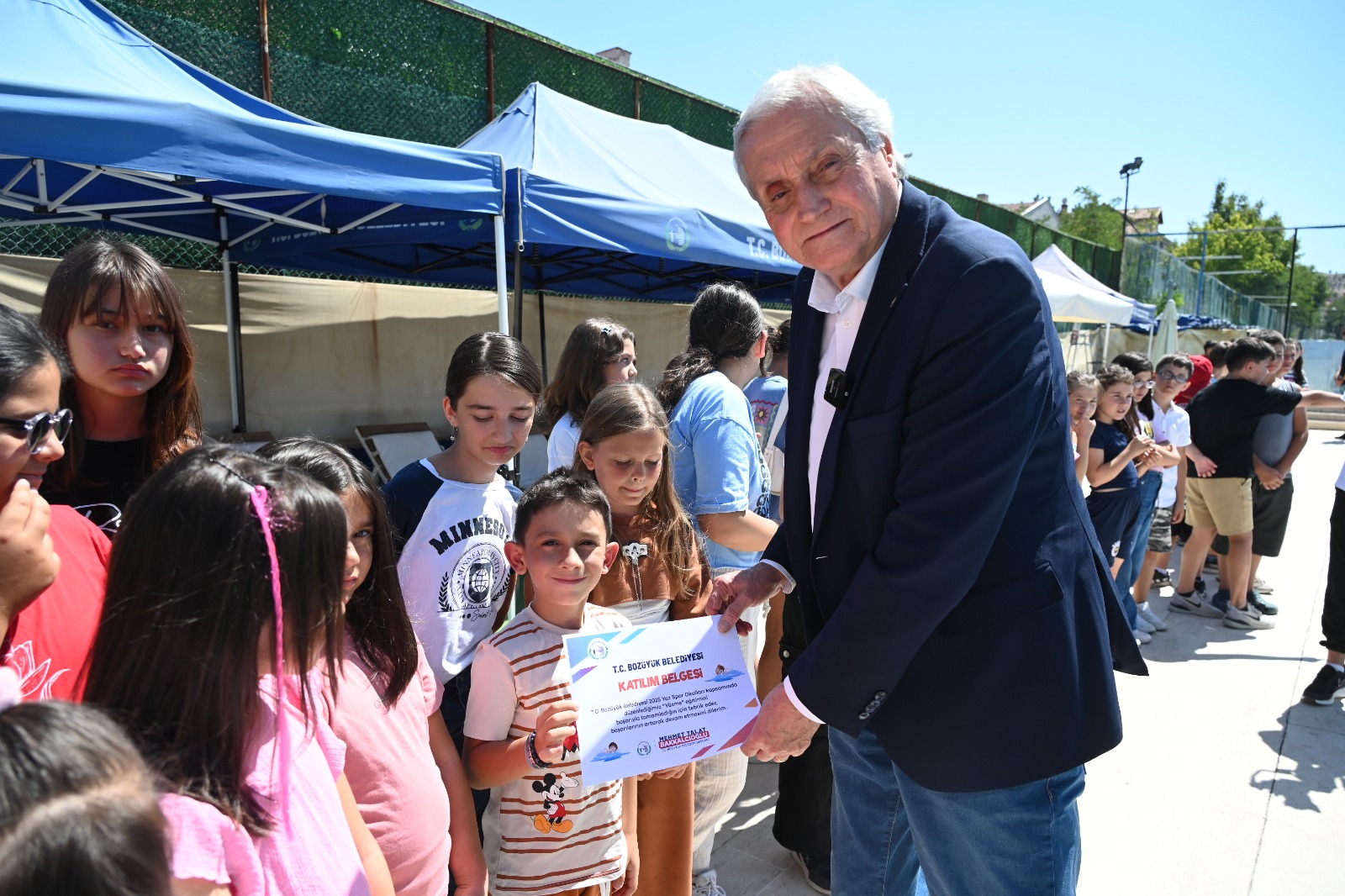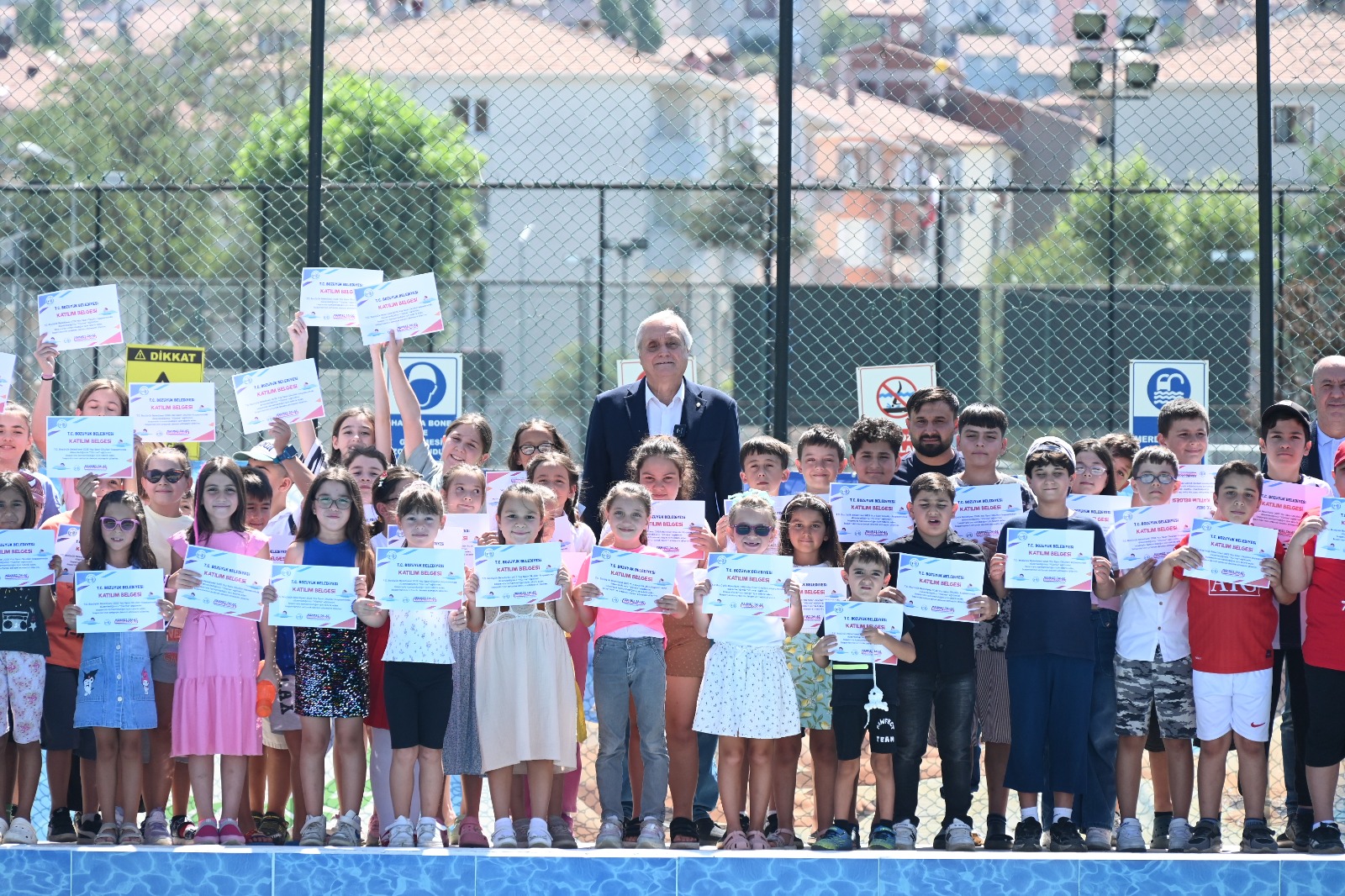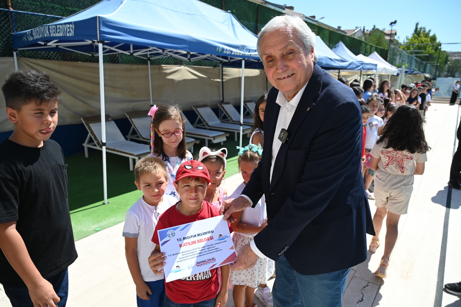 Bozüyük Belediyesi Yaz Spor Okulları yüzme kursunu başarı ile tamamlayan öğrenciler katılım belgelerini Bozüyük Belediye Başkanı Mehmet Talat Bakkalcıoğlu’nun elinden aldı.